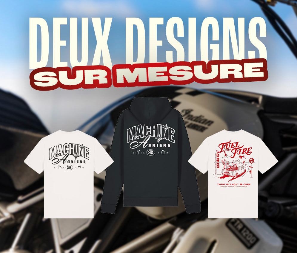 Machine Arrière propose des collections uniques inspirées de l'univers de la moto. Chaque édition raconte une histoire, et est imprimée en quantité limitée.