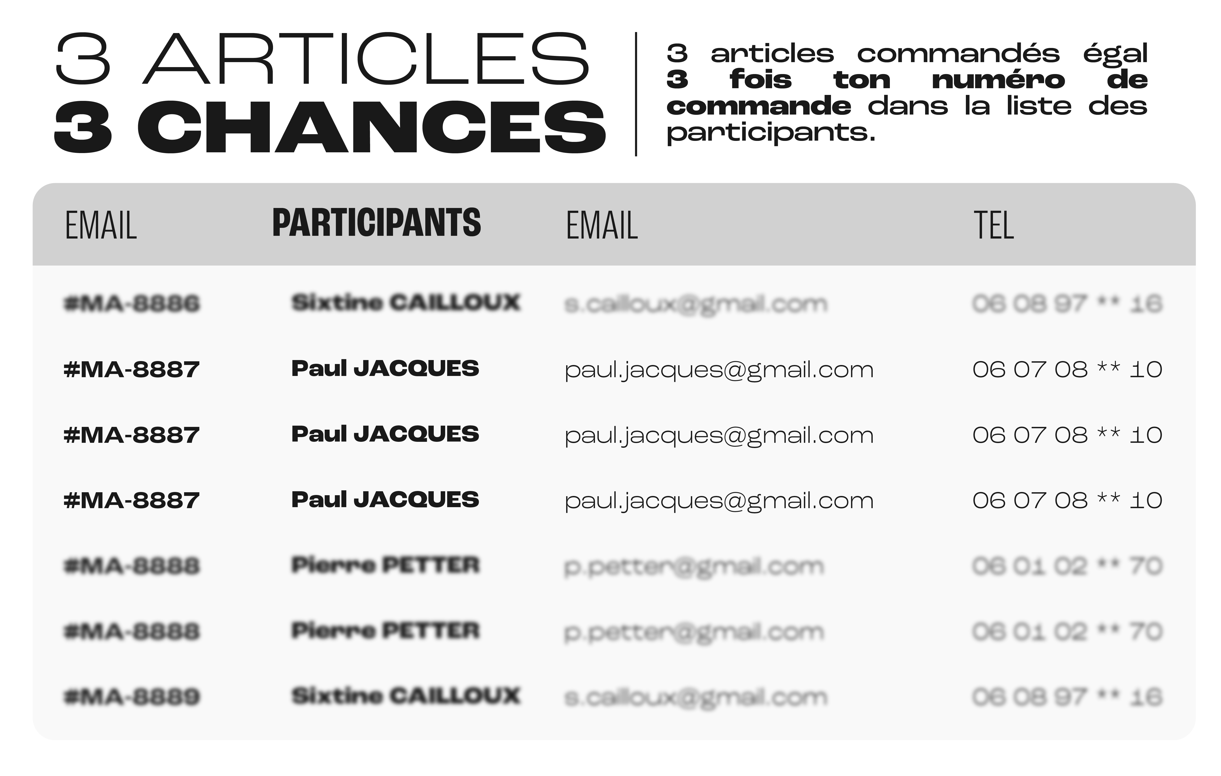 Si plusieurs articles sont associés à une participation, le numéro de commande sera inscrit autant de fois que le nombre d’articles dans la liste du tirage au sort.