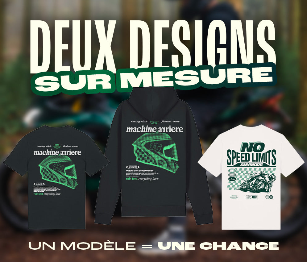 Machine Arrière propose des collections uniques inspirées des motos misent en jeux. Chaque édition raconte une histoire, imprimée en quantité limitée avec des designs qui ne seront pas réédités une fois le concours terminé.